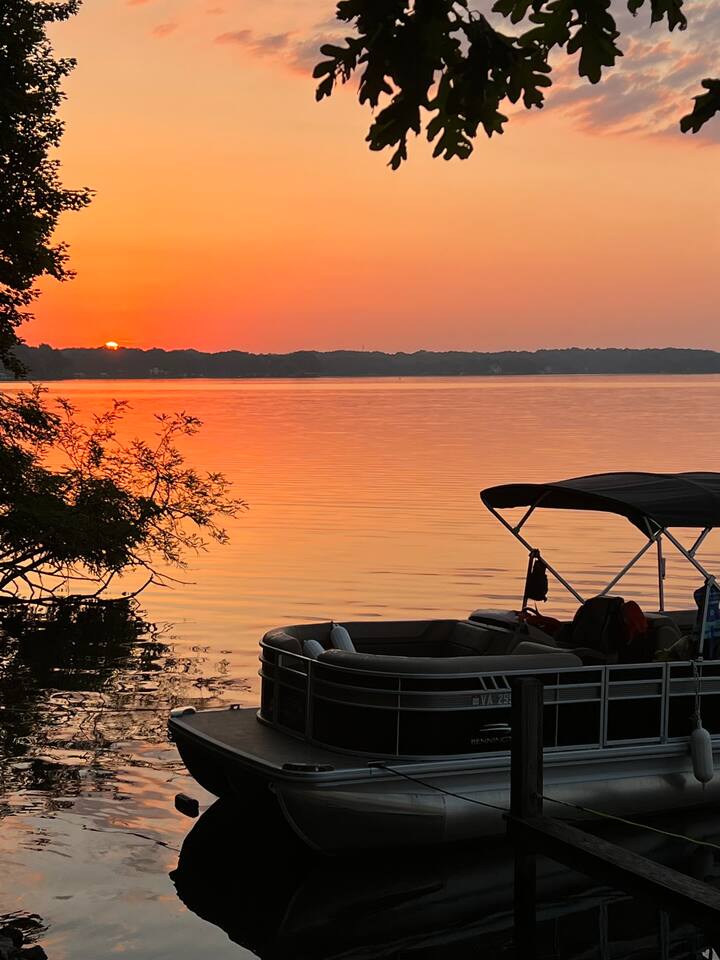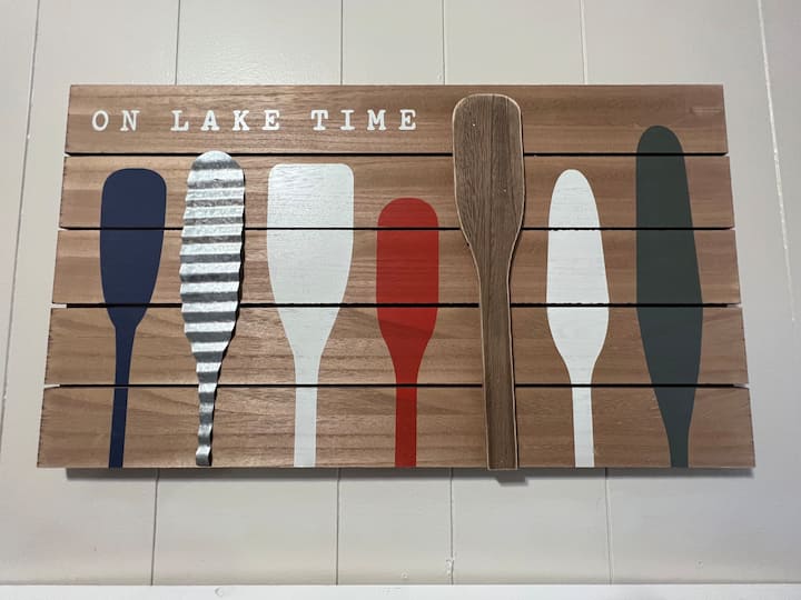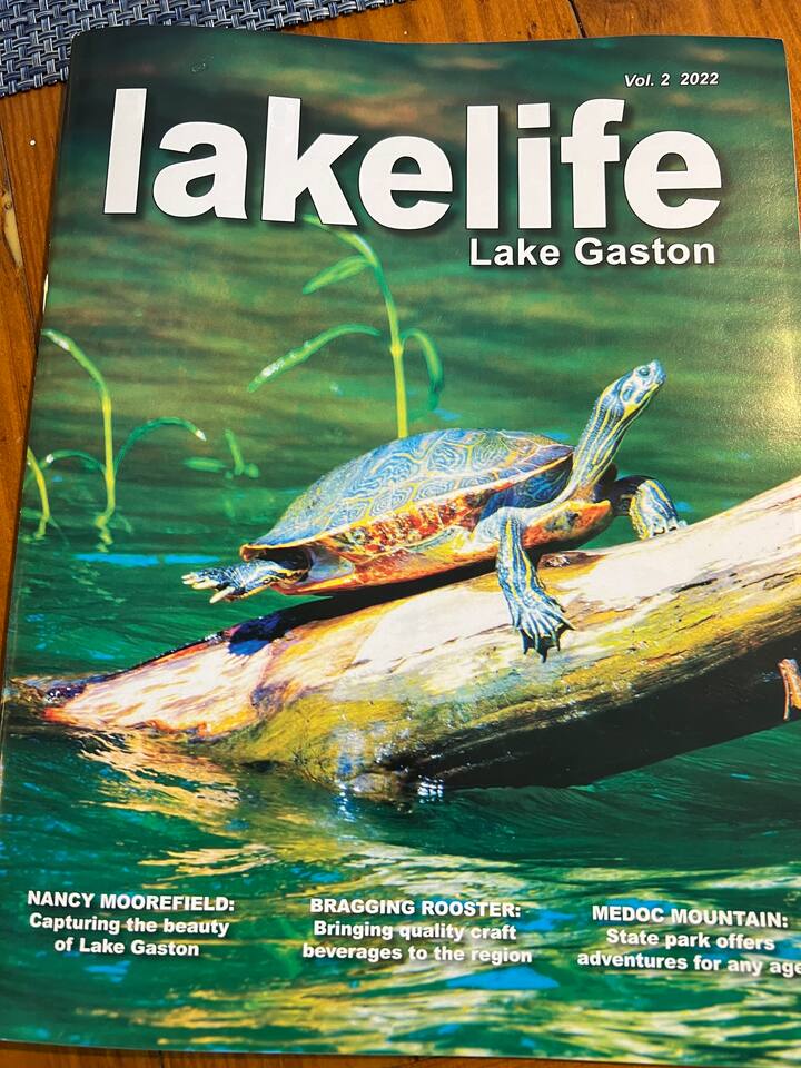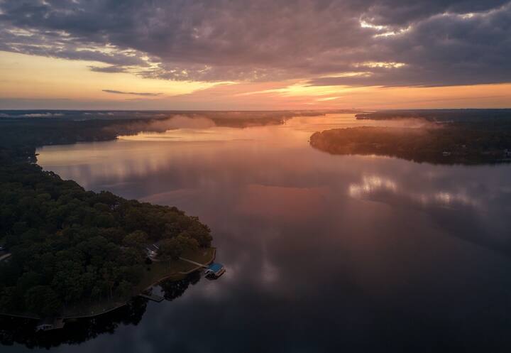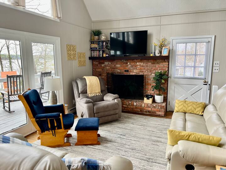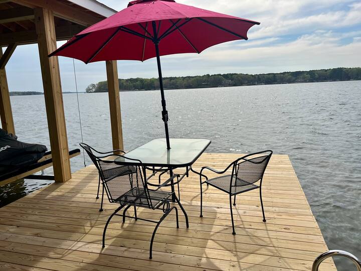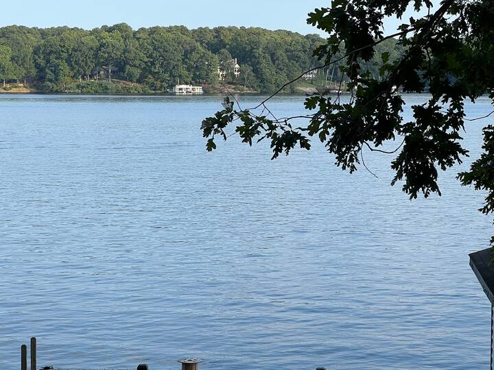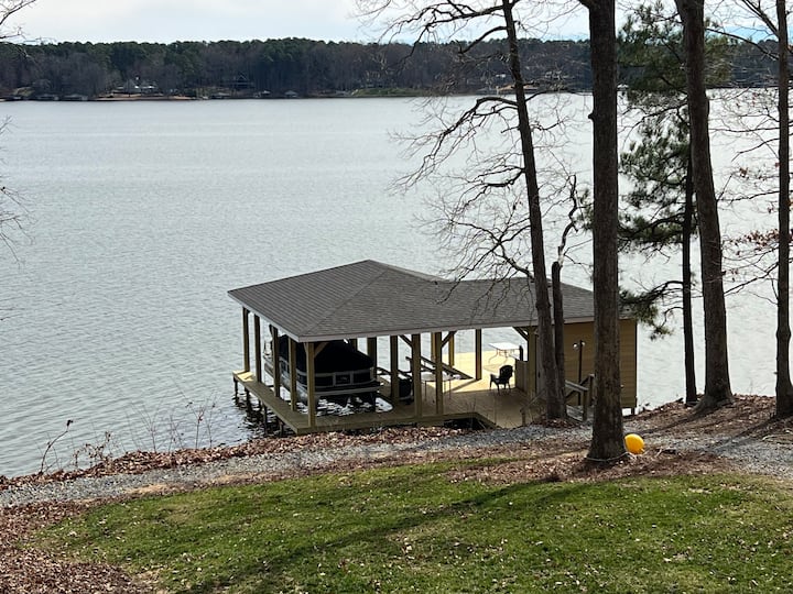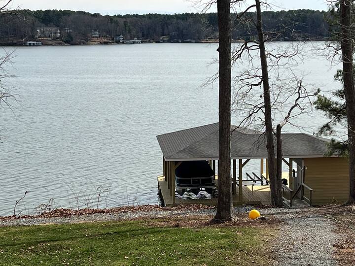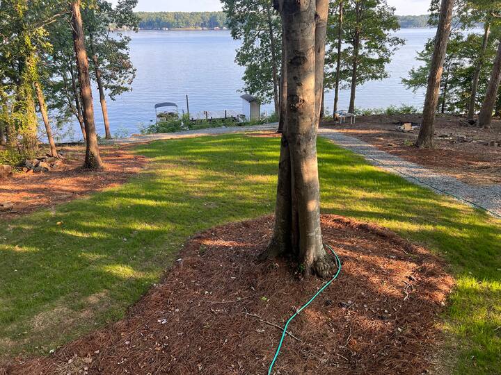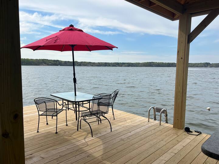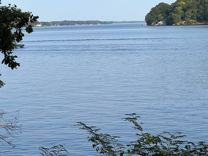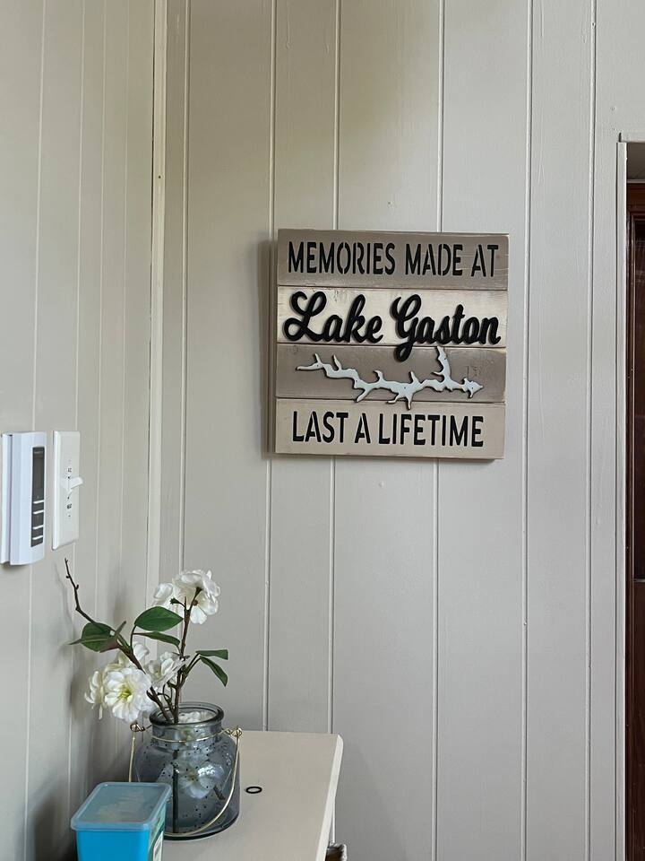 Huge deck overlooking the biggest part of Lake Gaston. Deck furniture, Grill, firepit. Living room has reclining leather couches. Large dining table. Small but fully equipped kitchen. Swing set. Chairs and water toys on dock, including canoe, kayak, paddleboard, life jackets, and furniture for lounging.