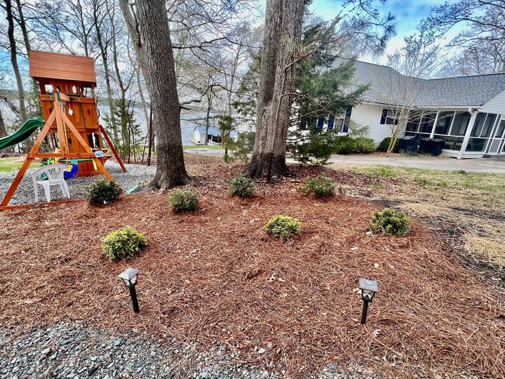 Playground is now mulchec and a new hardscape pathway is in from the house to the lake